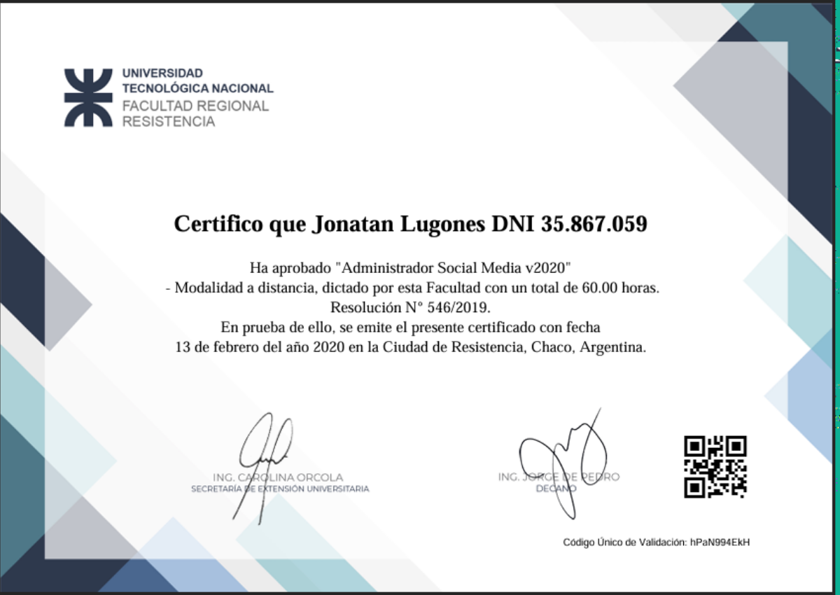 Este reconocimiento valida la formación de Jonatan Lugones en estrategias de marketing digital, redes sociales y comunicación online, con un total de 120 horas académicas cursadas bajo modalidad a distancia.