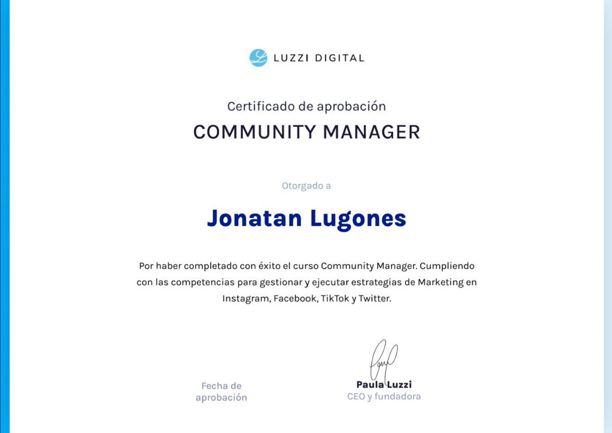 Certificado de aprobación emitido por Luzzi Digital, que acredita la finalización del curso Community Manager.